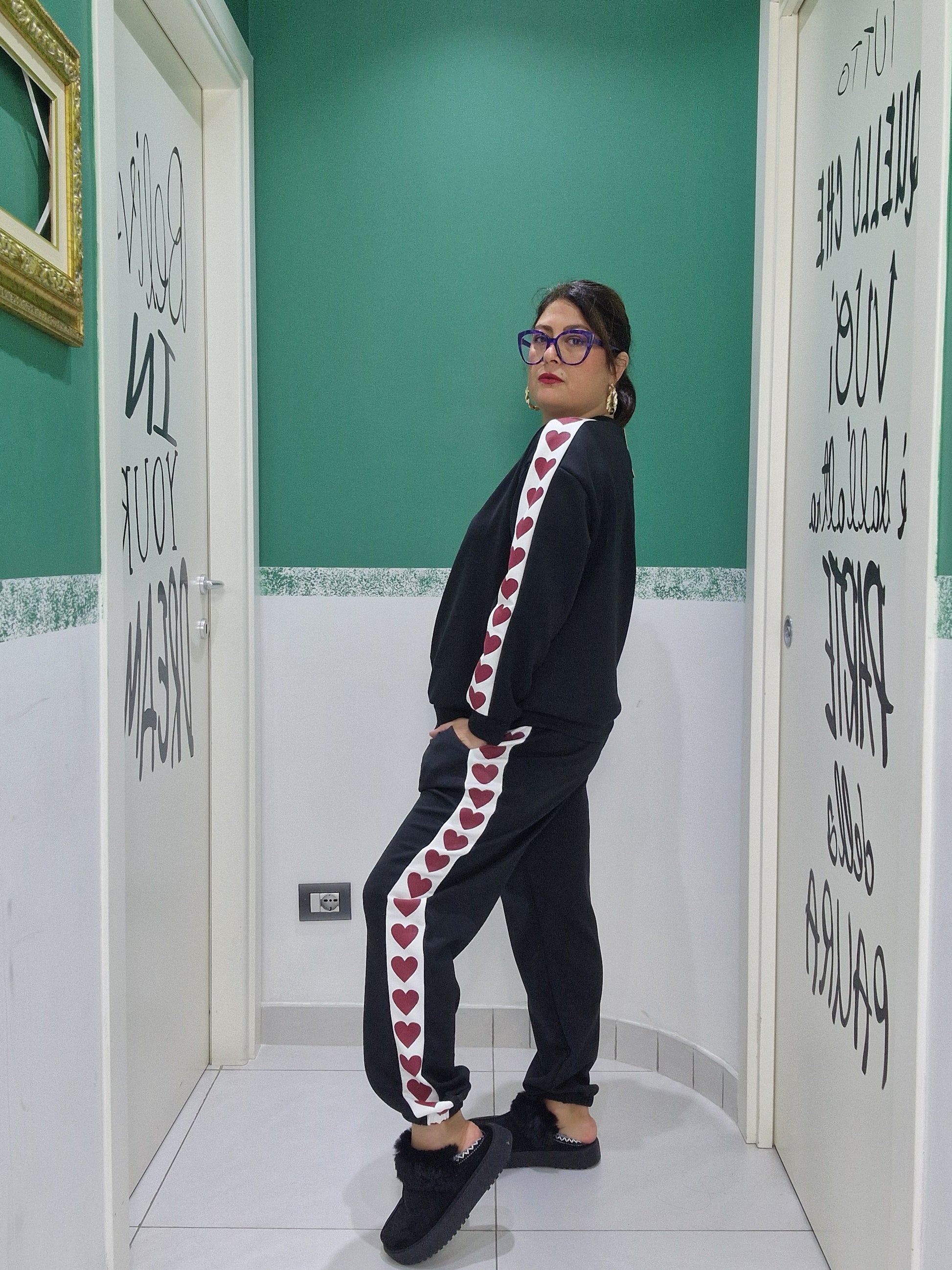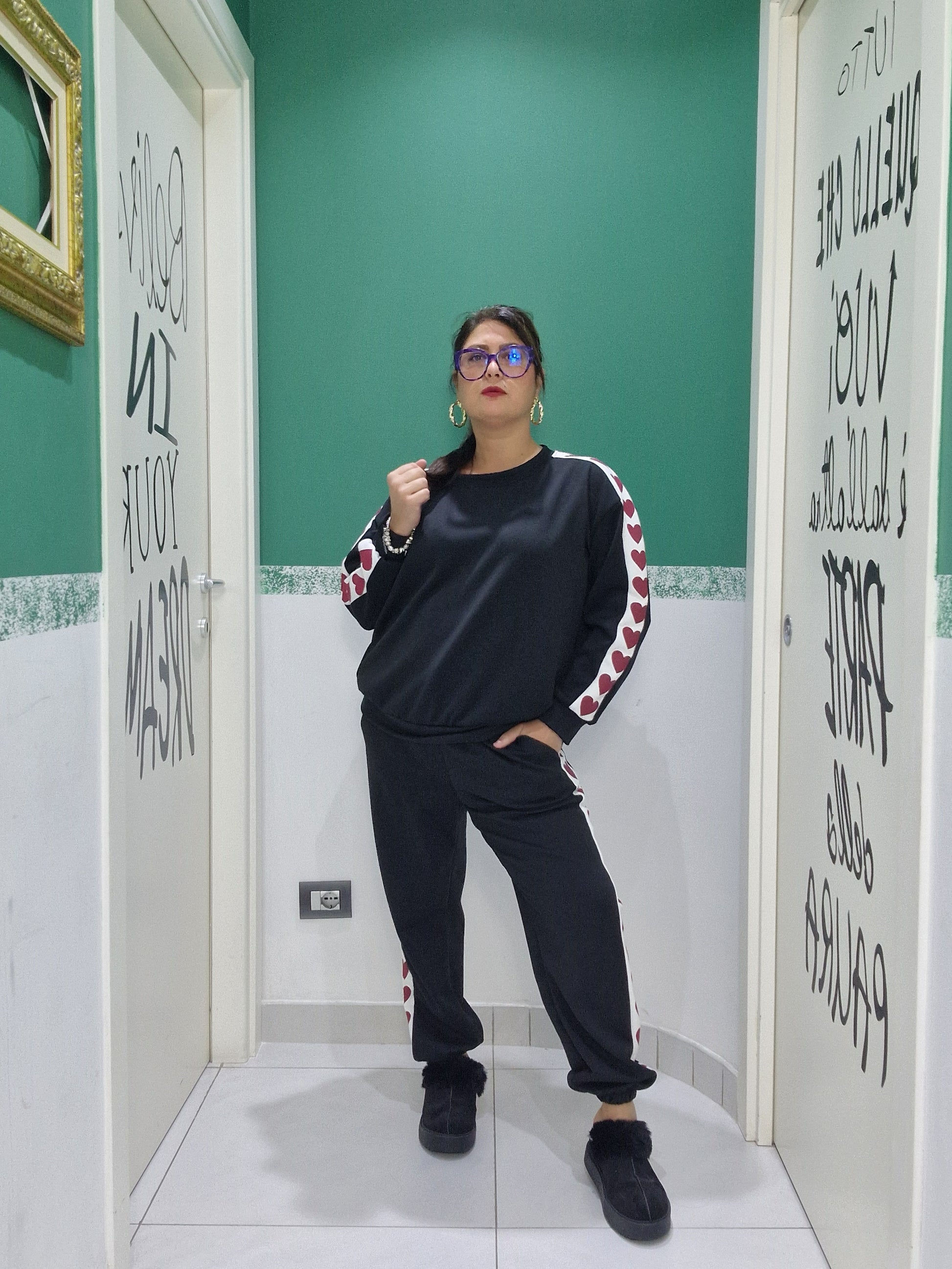 Maglia: seno 140cm fianchi 120cm (estensione massima tessuto teso)Lunghezza 65cmPantalone: elastico in vita 120cm fianchi 130cm (estensione massima tessuto teso)lunghezza 96cm