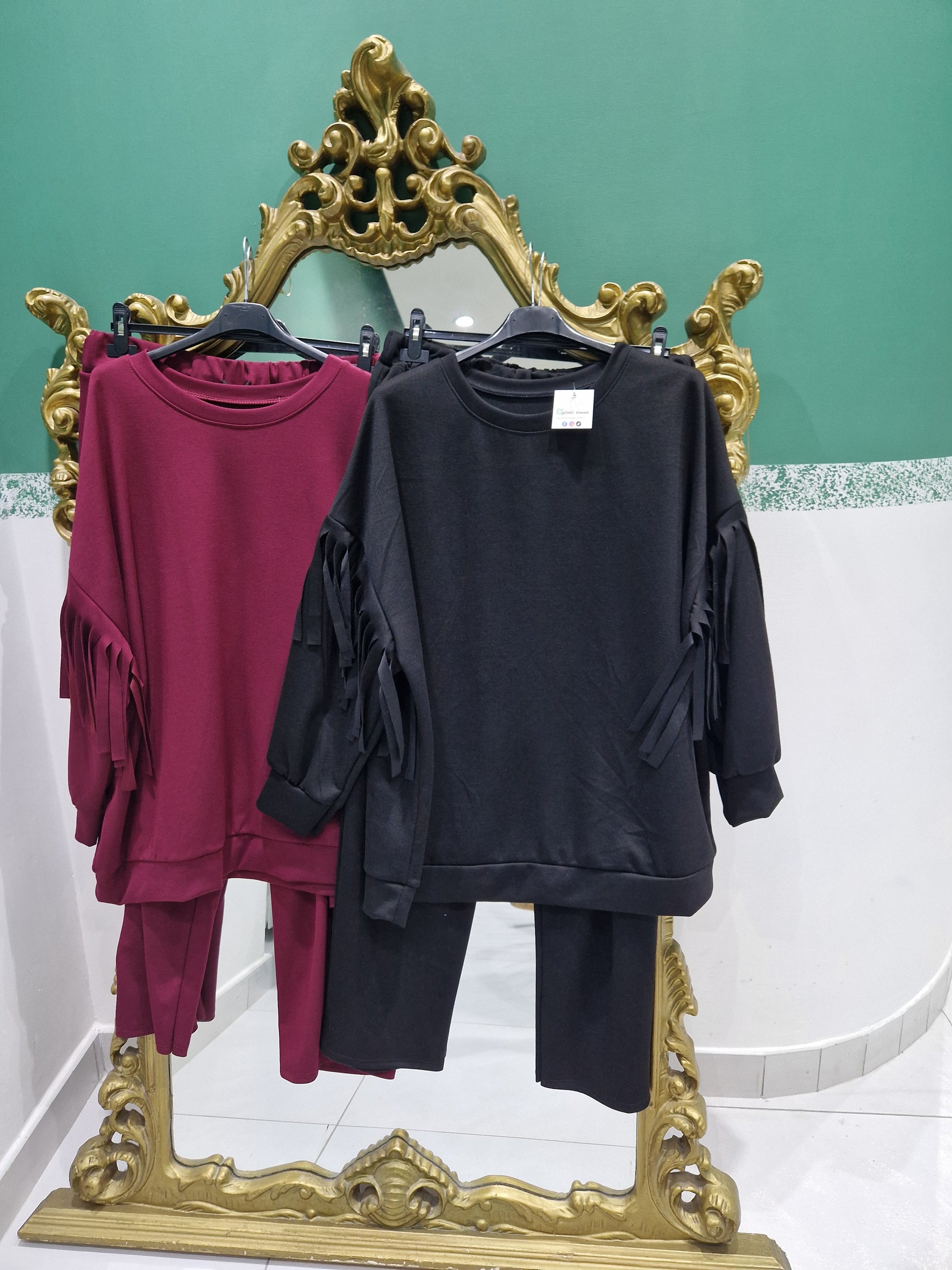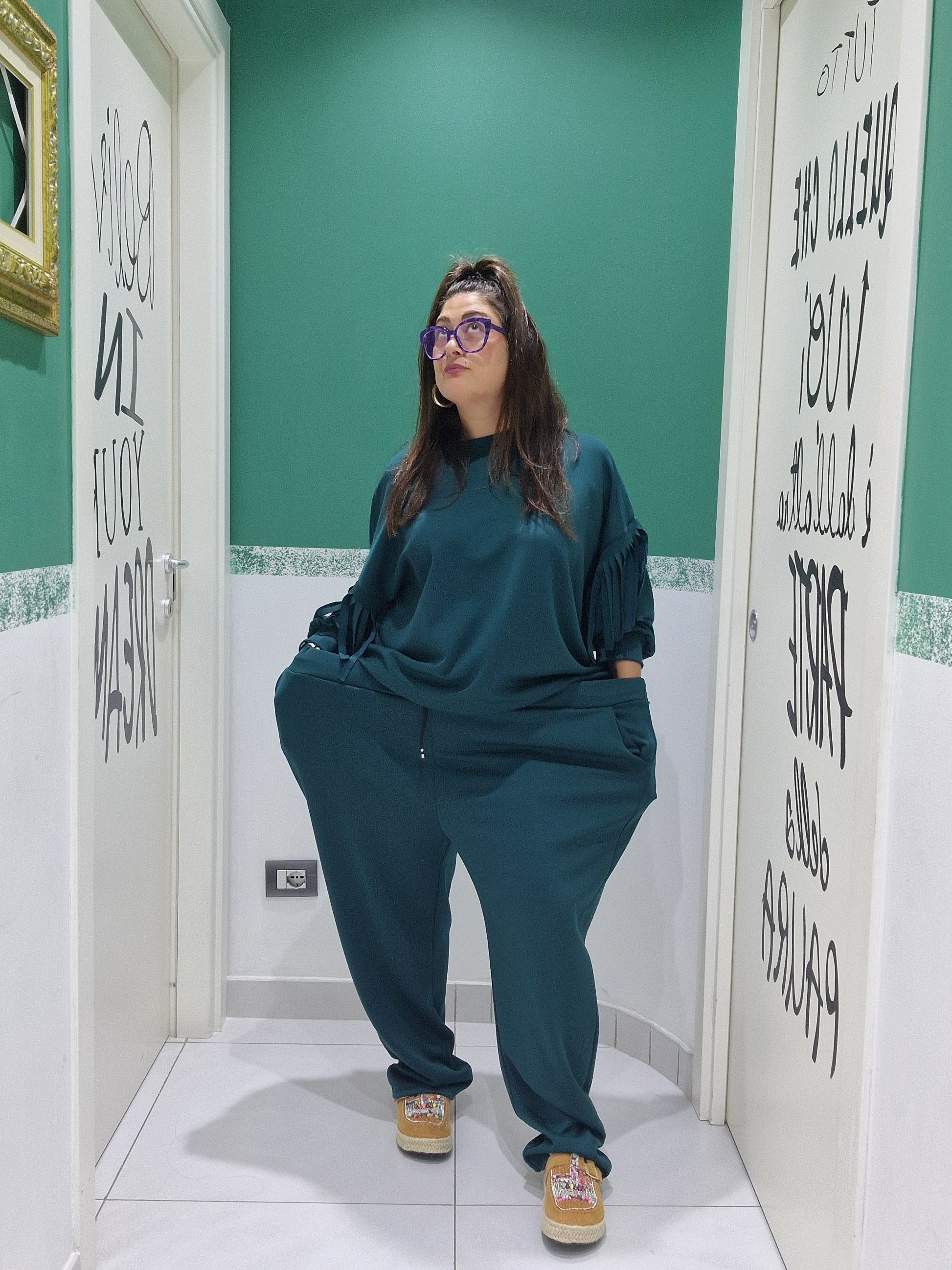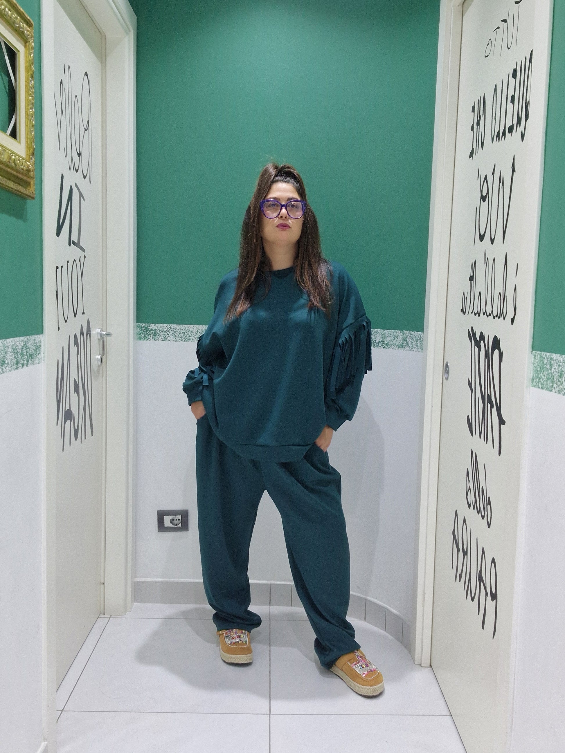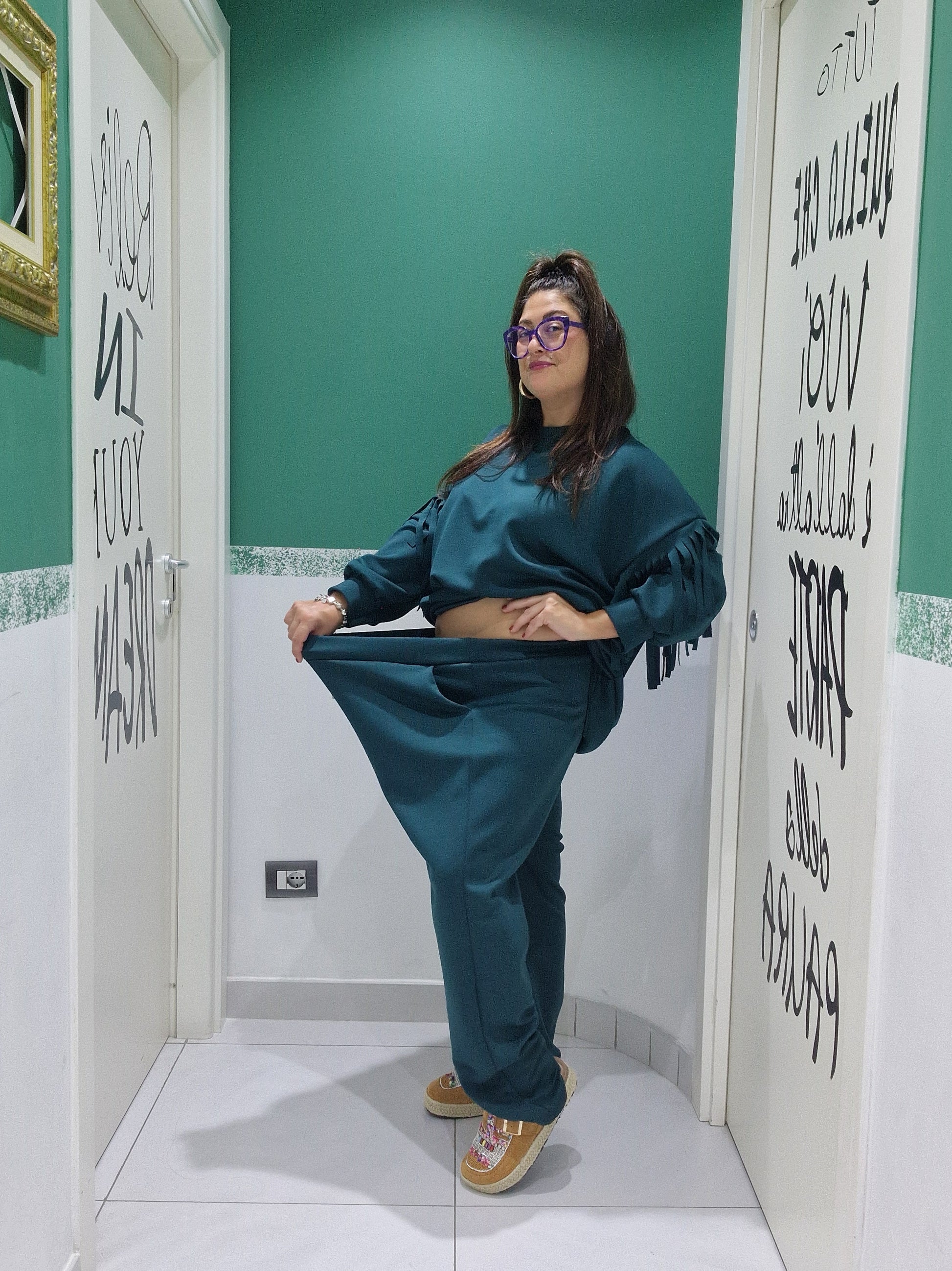 Maglia: seno 160cm fianchi 150cm (estensione massima tessuto teso)Lunghezza 73cmPantalone: elastico in vita 146cm fianchi 160cm (estensione massima tessuto teso (Lunghezza 100cm